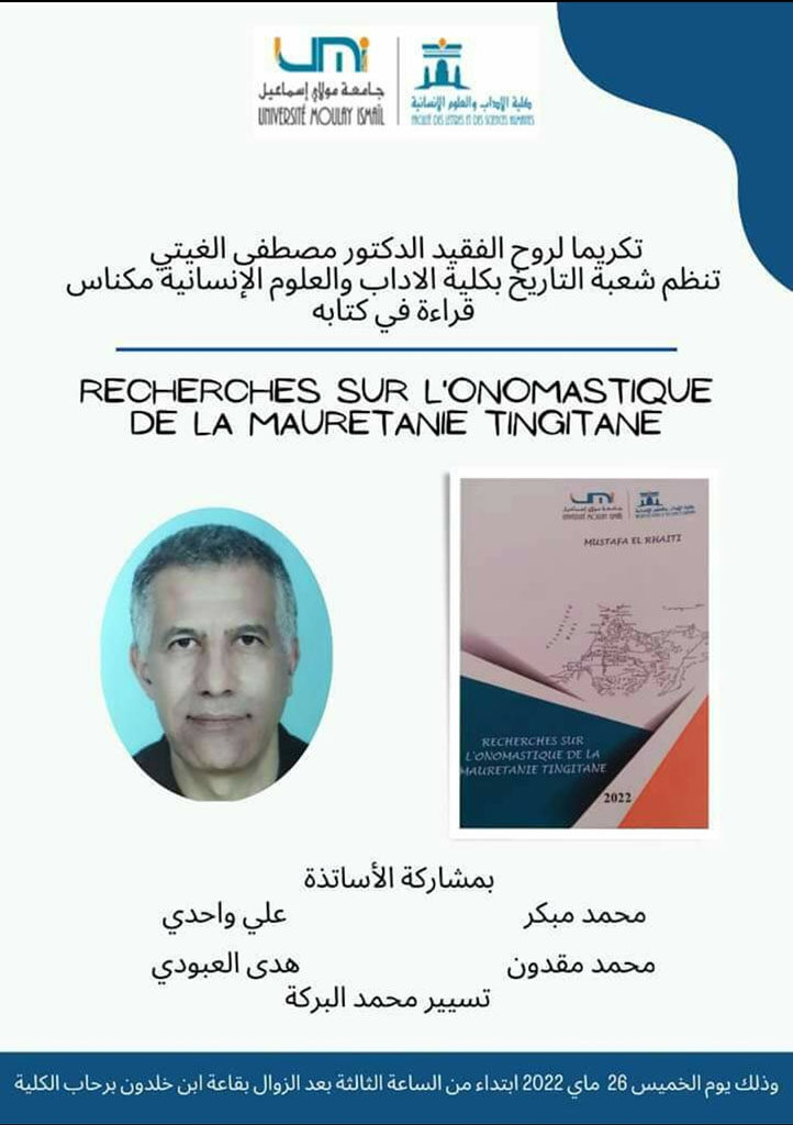 Vous êtes ici: Accueil / News de l'histoire et des historiens / تكريما لروح الفقيد الأستاذ مصطفى الغيتي، تنظم شعبة التاريخ بكلية الآداب والعلوم الإنسانية مكناس، قراءة في كتابه: RECHERCHES SUR L’ONOMASTIQUE DE LA MAURETANIE TINGITANE