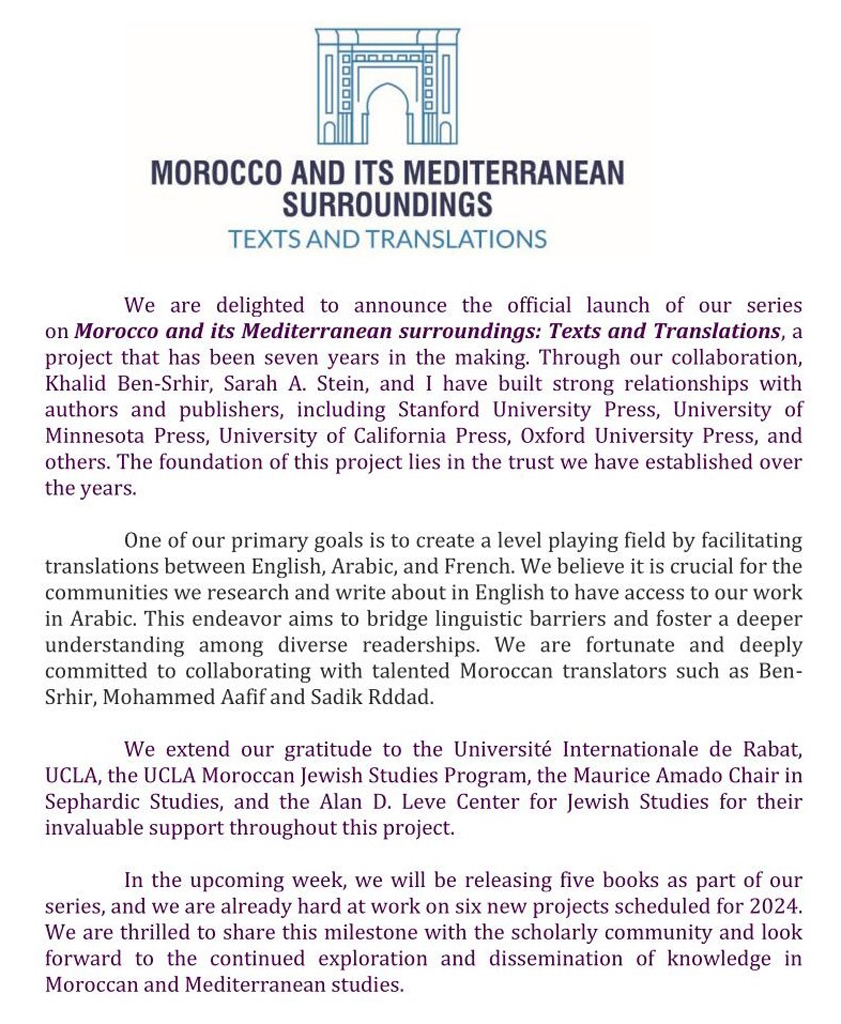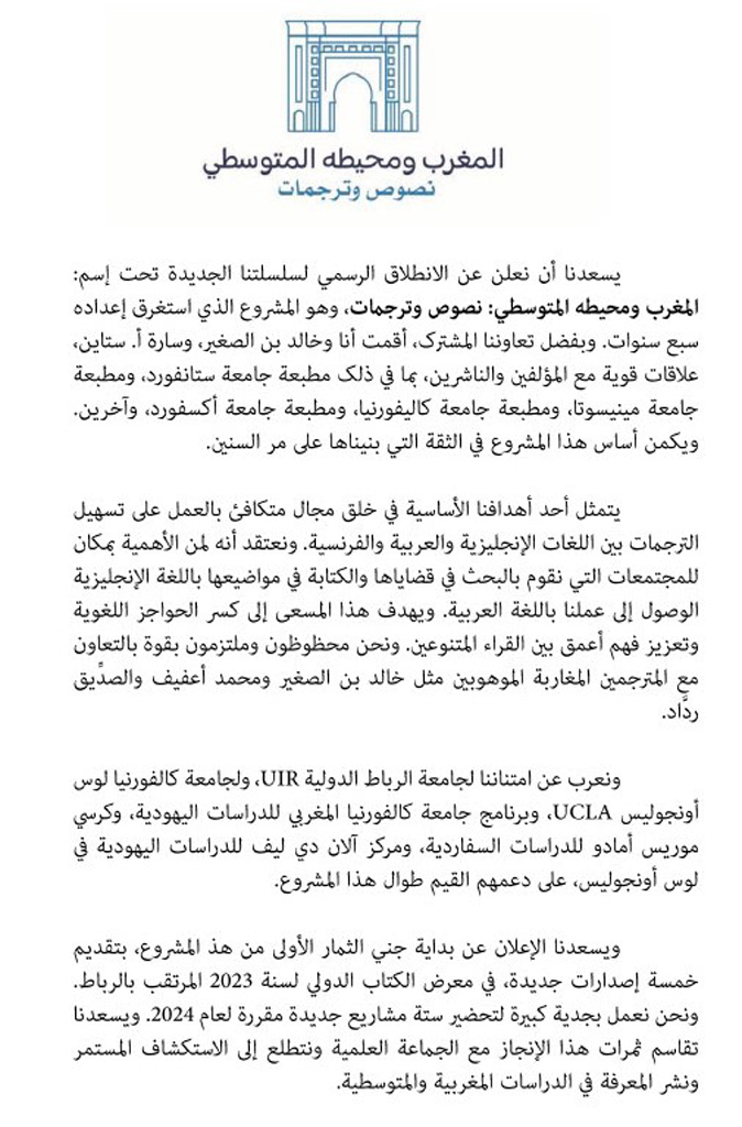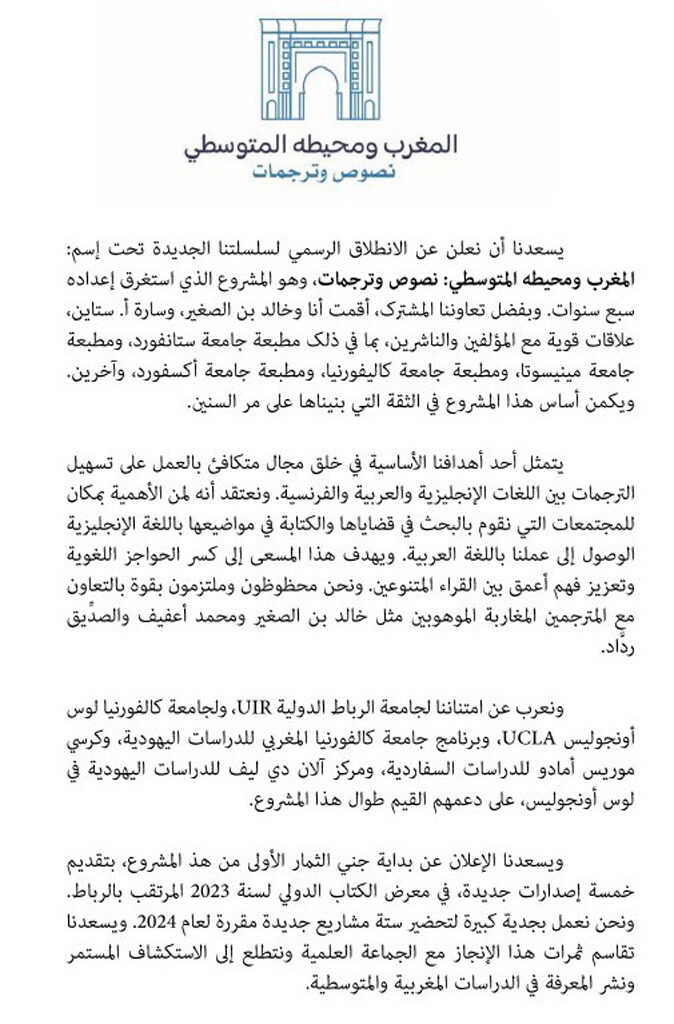 إعلان، بمناسبة المعرض الدولي للنشر والكتاب دورة 2023، الرباط، عن انطلاق مشروع جديد للنشر والترجمة لسلسلة من الإصدارت تحت اسم: المغرب ومحيطه المتوسطي: نصوص وترجمات.