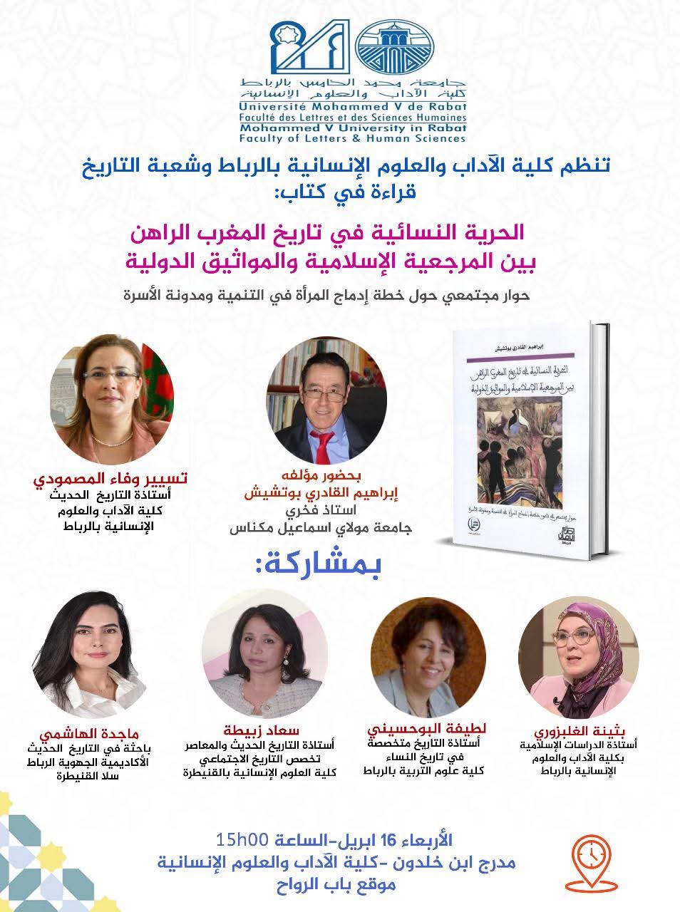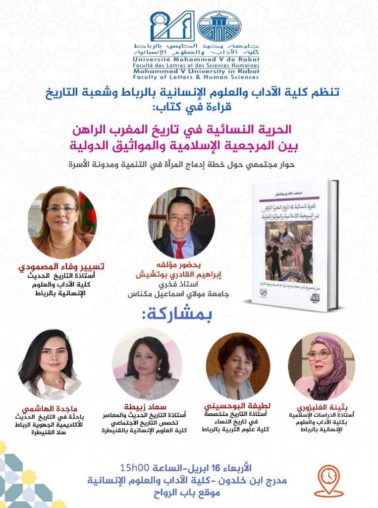 تنظم كلية الآداب والعلوم الإنسانية بالرباط، وشعبة التاريخ قراءة في كتاب: “الحرية النسائية في تاريخ المغرب الراهن بين المرجعية الإسلامية والمواثيق الدولية: حوار مجتمعي في ضوء خطة إدماج المرأة في التنمية ومدونة الأسرة “، بحضور مؤلفه إبراهيم القادري بوتشيش، الأستاذ الفخري بجامعة مولاي إسماعيل بمكناس.