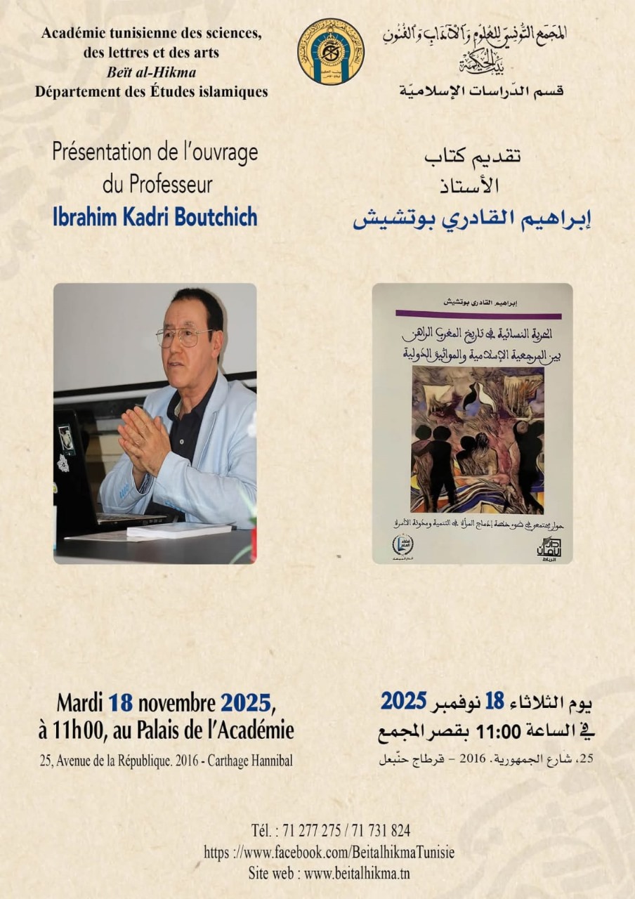 Vous êtes ici: Accueil / News de l'histoire et des historiens / يستضيف المجمع التونسي للعلوم والآداب والفنون، بيت الحكمة، قسم الدراسات الإسلامية بتونس، الأستاذ إبراهيم القادري بوتشيش لتقديم كتابه “الحرية النسائية في تاريخ المغرب الراهن بين المرجعية الإسلامية والمواثيق الدولية”، وذلك يوم الثلاثاء 18 نوفمبر 2025، على الساعة 11:00 صباحا، بقصر المجمع.
