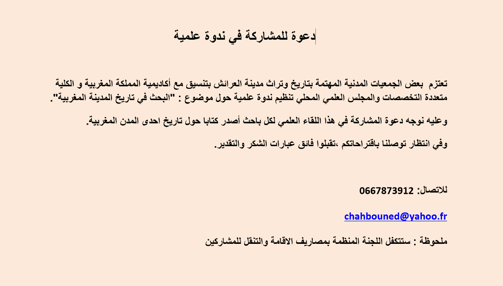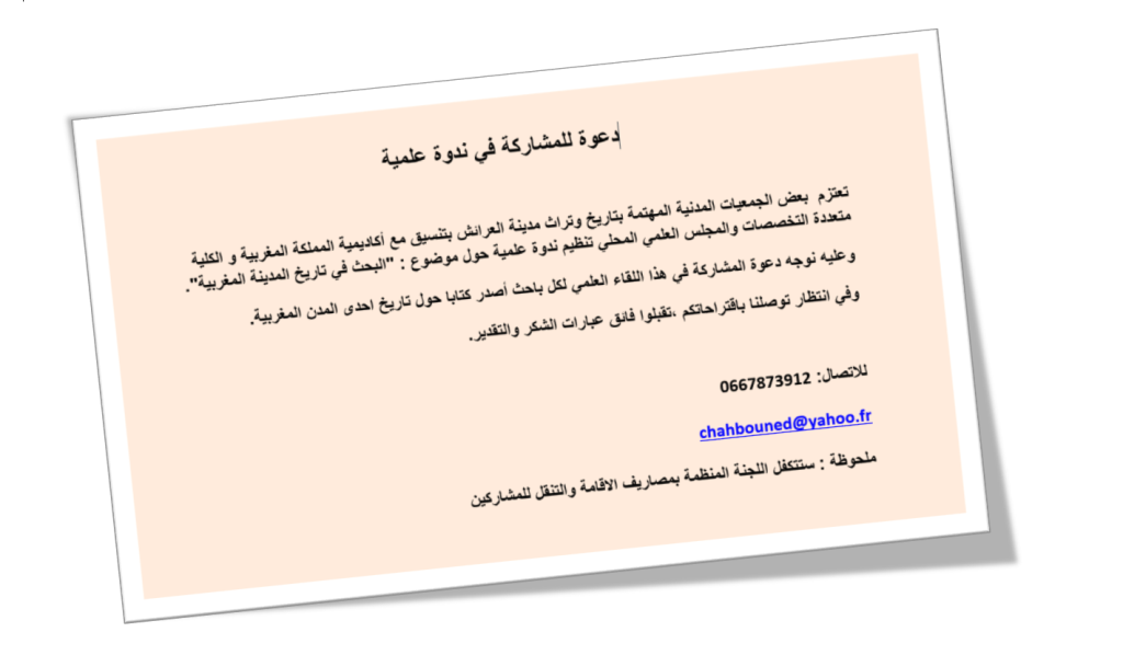 دعوة للمشاركة في ندوة علمية في موضوع: البحث في تاريخ المدينة المغربية Publié par: ABDELMALEK NASSIRI le 15:38 dans News de l'histoire et des historiens 2 commentaires Partager ! tweet