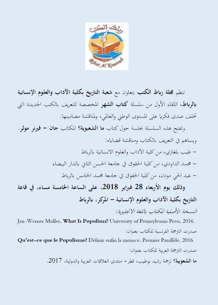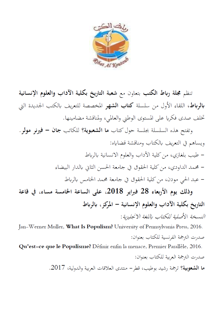 Vous êtes ici: Accueil / News de l'histoire et des historiens / تنظم مجلة رباط الكتب بتعاون مع شعبة التاريخ بكلية الآداب والعلوم الإنسانية بالرباط، اللقاء الأول من سلسلة كتاب الشهر المخصصة للتعريف بالكتب الجديدة التي تخلف صدى فكريا على المستوى الوطني والعالمي، ولمناقشة مضامينها.