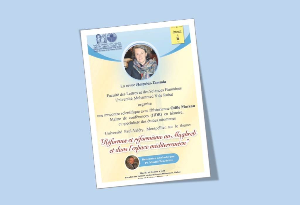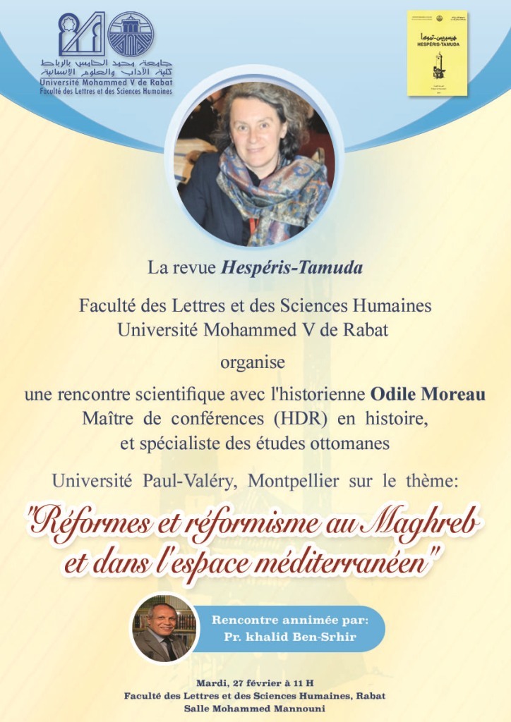 Vous êtes ici: Accueil / News de l'histoire et des historiens / تنظم مجلة هيسريس-تمودة، لقاء علميا مع أوديل مورو، المؤرخة الغرنسية المتخصصة في الدراسات العثمانية والعالم المتوسطي، في موضوع: الإصلاح والحركات الإصلاحية في البلاد المغاربية والمجال المتوسطي. وذلك يوم الثلاثاء 27 فيراير 2018، ابتداء من الساعة الحادية عشرة صباحا في قاعة محمد المنوني بكلية الآداب والعلوم الإنسانية بالرباط. والدعوة عامة.