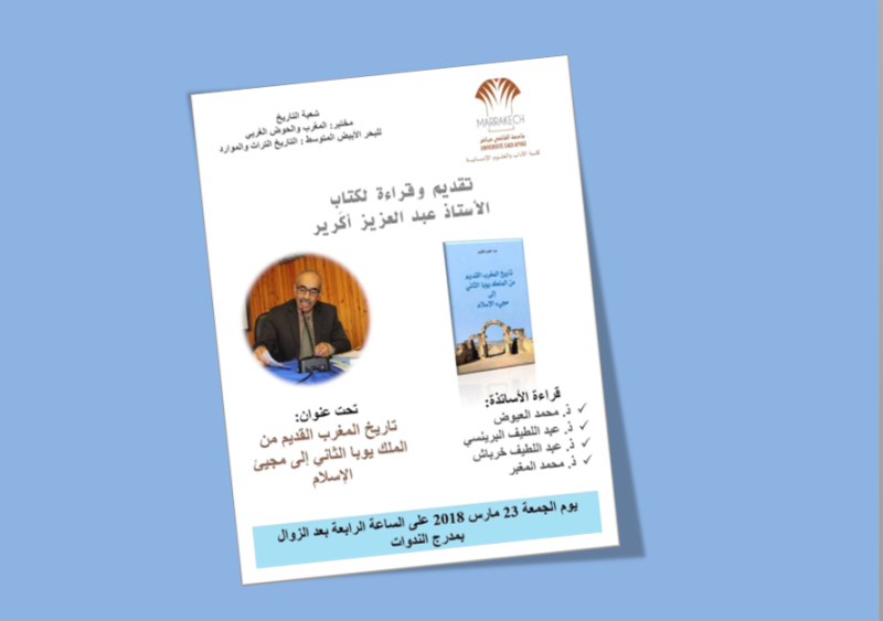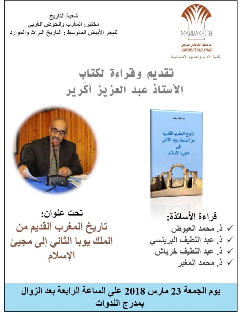 الإعلان عن تقديم وقراءة في كتاب الأستاذ عبد العزيز أكرير بكلية الآداب والعلوم الإنسانية بمراكش. Publié par: ABDELMALEK NASSIRI le 20:46 dans News de l'histoire et des historiens Laisser un commentaire Partager ! tweet