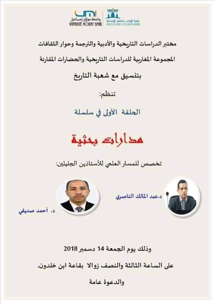 Vous êtes ici: Accueil / Archives du site / ينظم مختبر الدراسات التاريخية والأدبية والترجمة وحوار الثقافات والمجموعة المغاربية للدراسات التاريخية والحضارات المقارنة، بتنسيق مع شعبة التاريخ بكلية الآداب والعلوم الإنسانية بمكناس، الحلقة الأولى في سلسلة مدارات بحثية، تخصص للمسار العلمي للأستاذين عبد المالك ناصري وأحمد الصديقي.