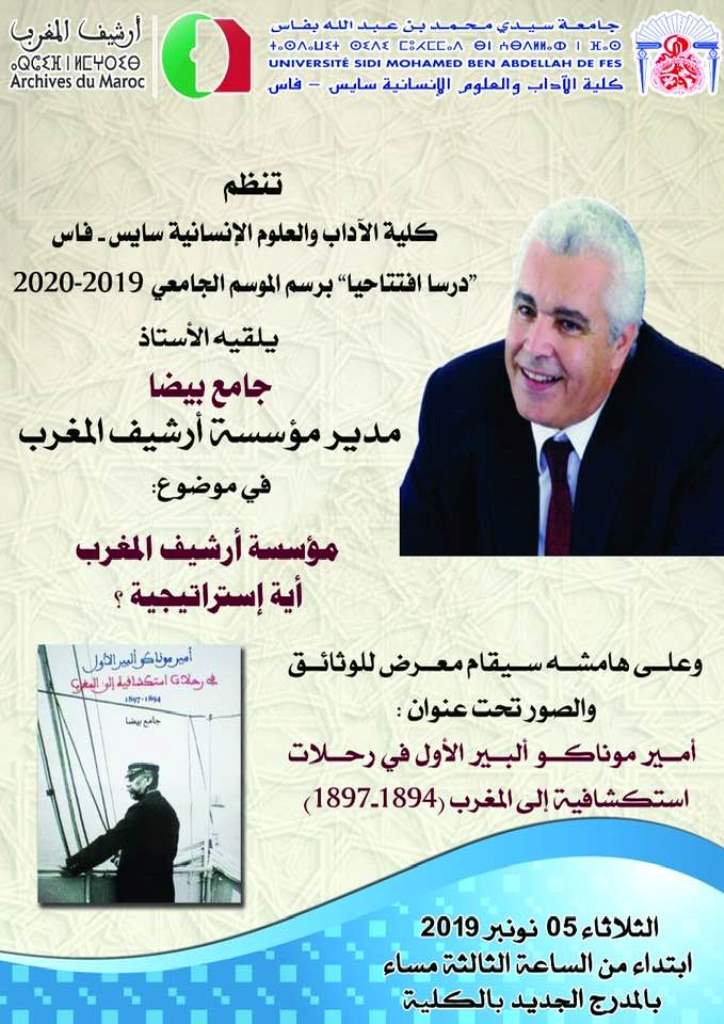تنظم كلية الآداب والعلوم الإنسانية سايس – فاس، درسا افتتاحيا برسم الموسم الجامعي 2019 – 2020، يلقيه الأستاذ جامع بيضا، مدير مؤسسة أرشيف المغرب في موضوع: مؤسسة أرشيف المغرب أية استراتيجية.
