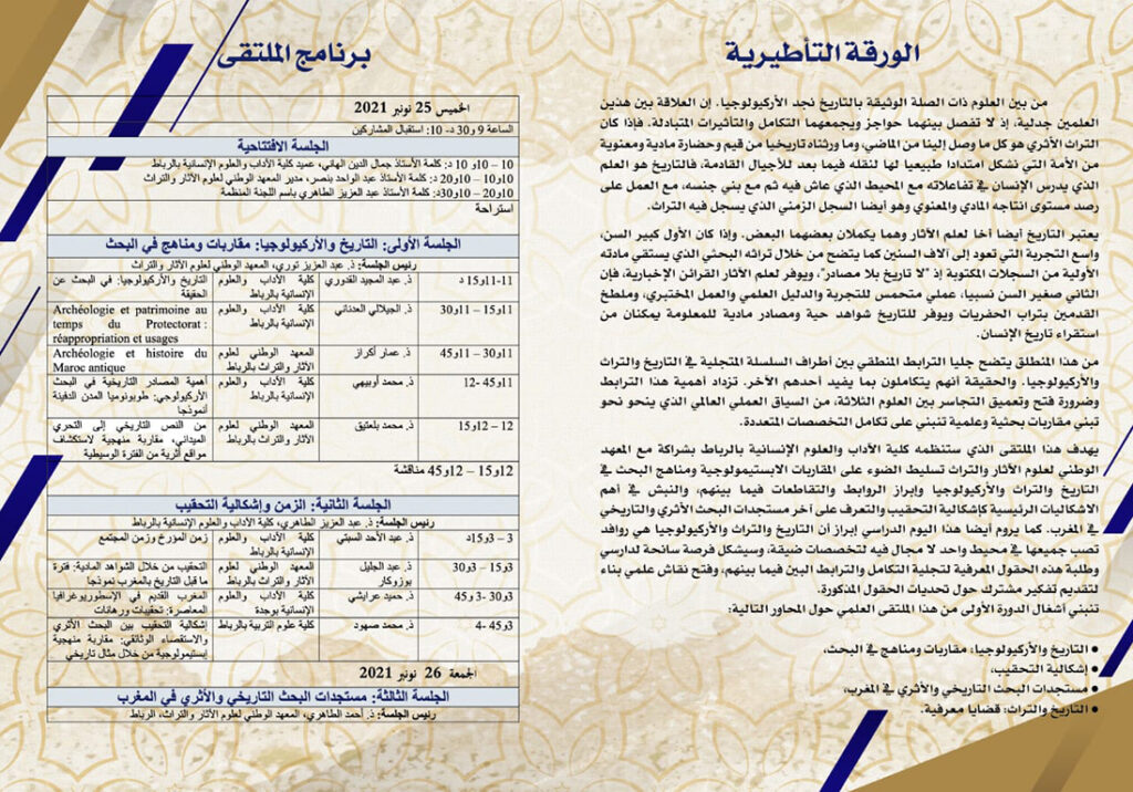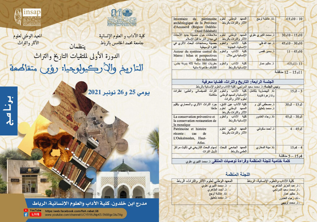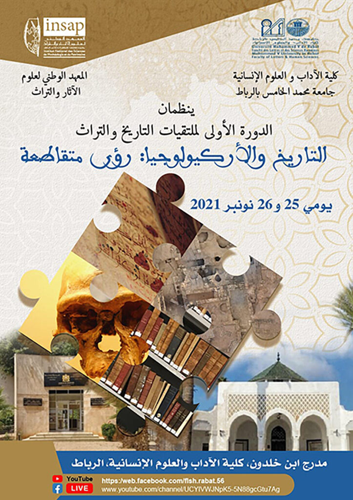 أنت هنا: الرئيسية / أخبار التاريخ والمؤرخين / تنظم كلية الآداب والعلوم الإنسانية، جامعة محمد الخامس بالرباط والمعهد الوطني لعلوم الآثار والتراث، الدورة الأولى لملتقيات التاريخ والتراث في موضوع: التاريخ والأركيولوجيا: رؤى متقاطعة، يومي 25 و26 نونبر 2021.