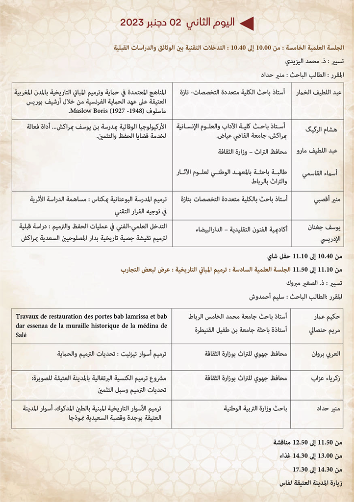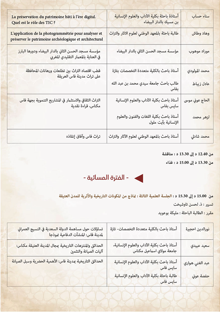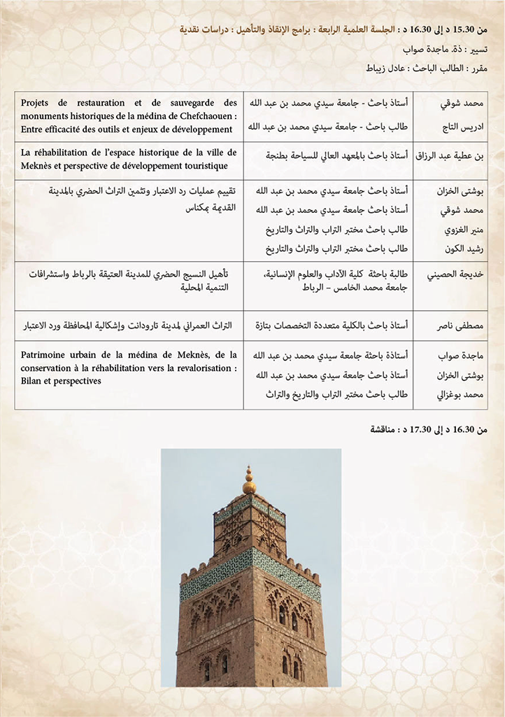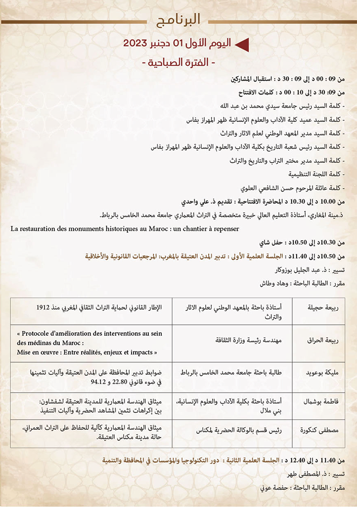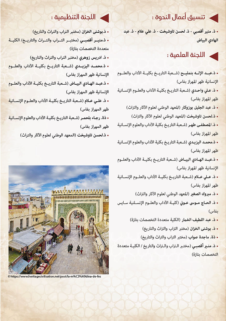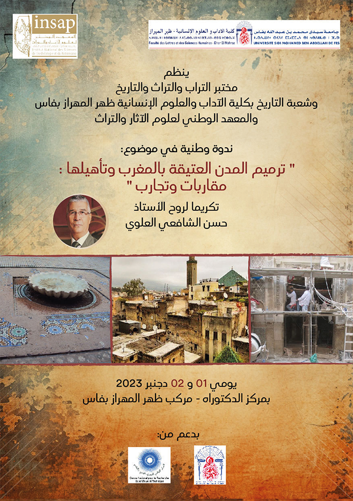 أنت هنا: الرئيسية / أخبار التاريخ والمؤرخين / ينظم مختبر التراب والتراث والتاريخ، وشعبة التاريخ بكلية الآداب والعلوم الإنسانية ظهر المهراز بفاس، والمعهد الوطني لعلوم الآثار والتراث، ندوة وطنية في موضوع: ترميم المدن العتيقة بالمغرب وتأهيلها: مقاربات وتجارب، تكريما لروح الأستاذ حسن الشافعي العلوي.