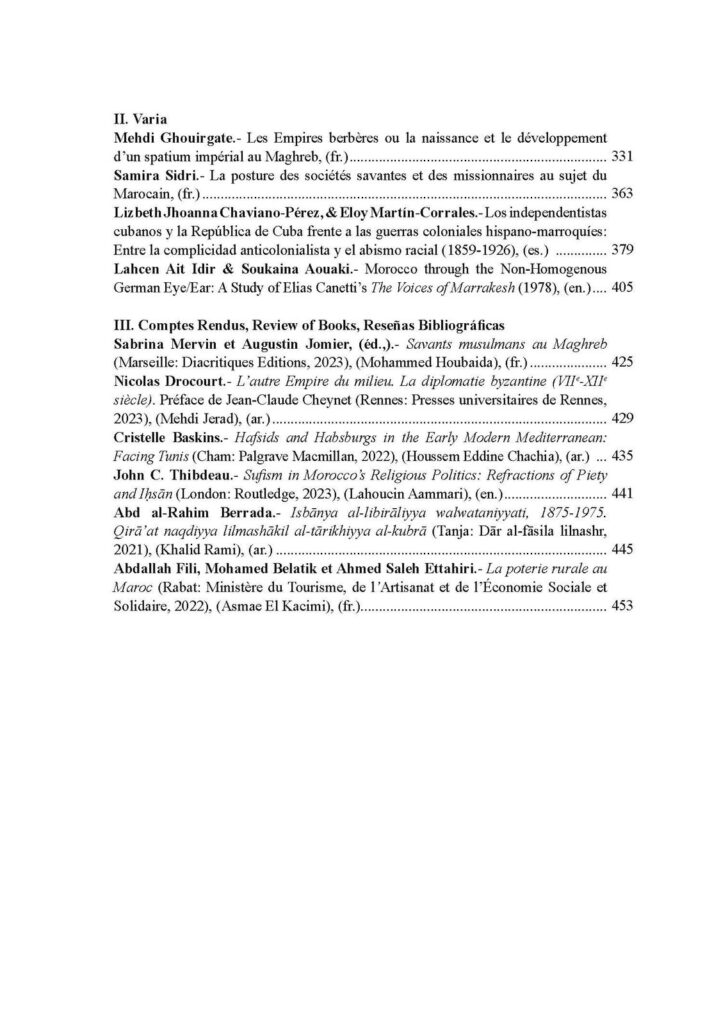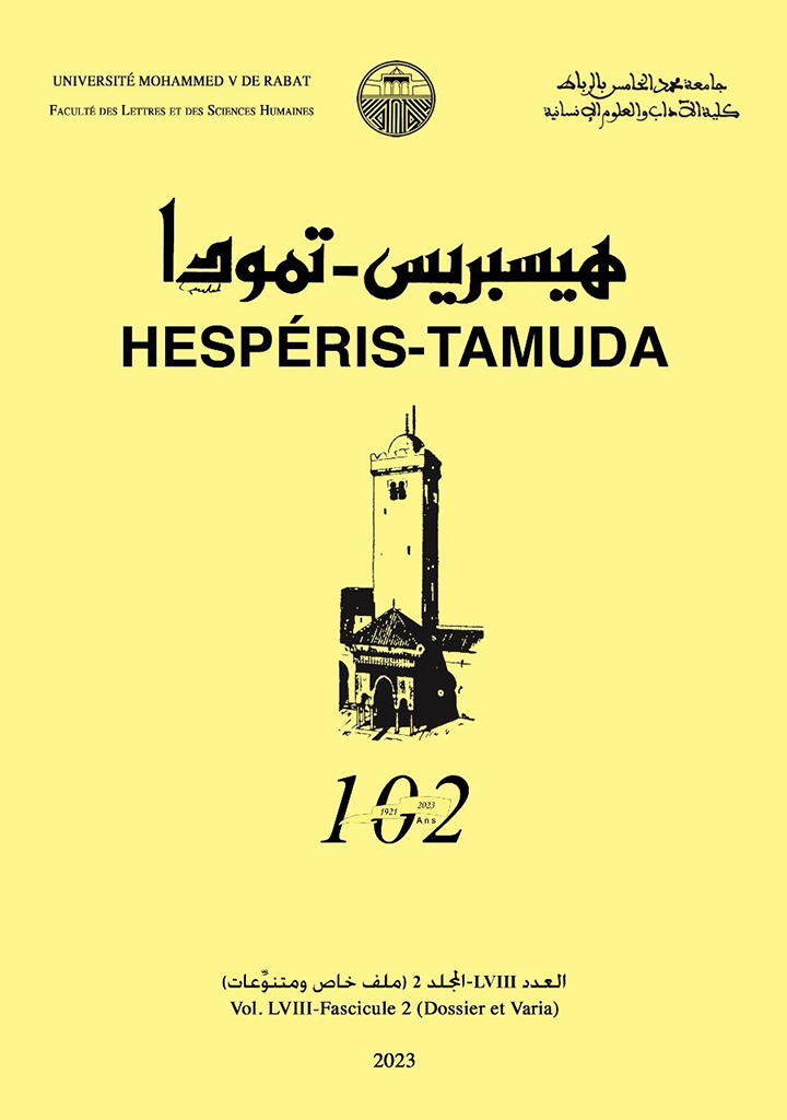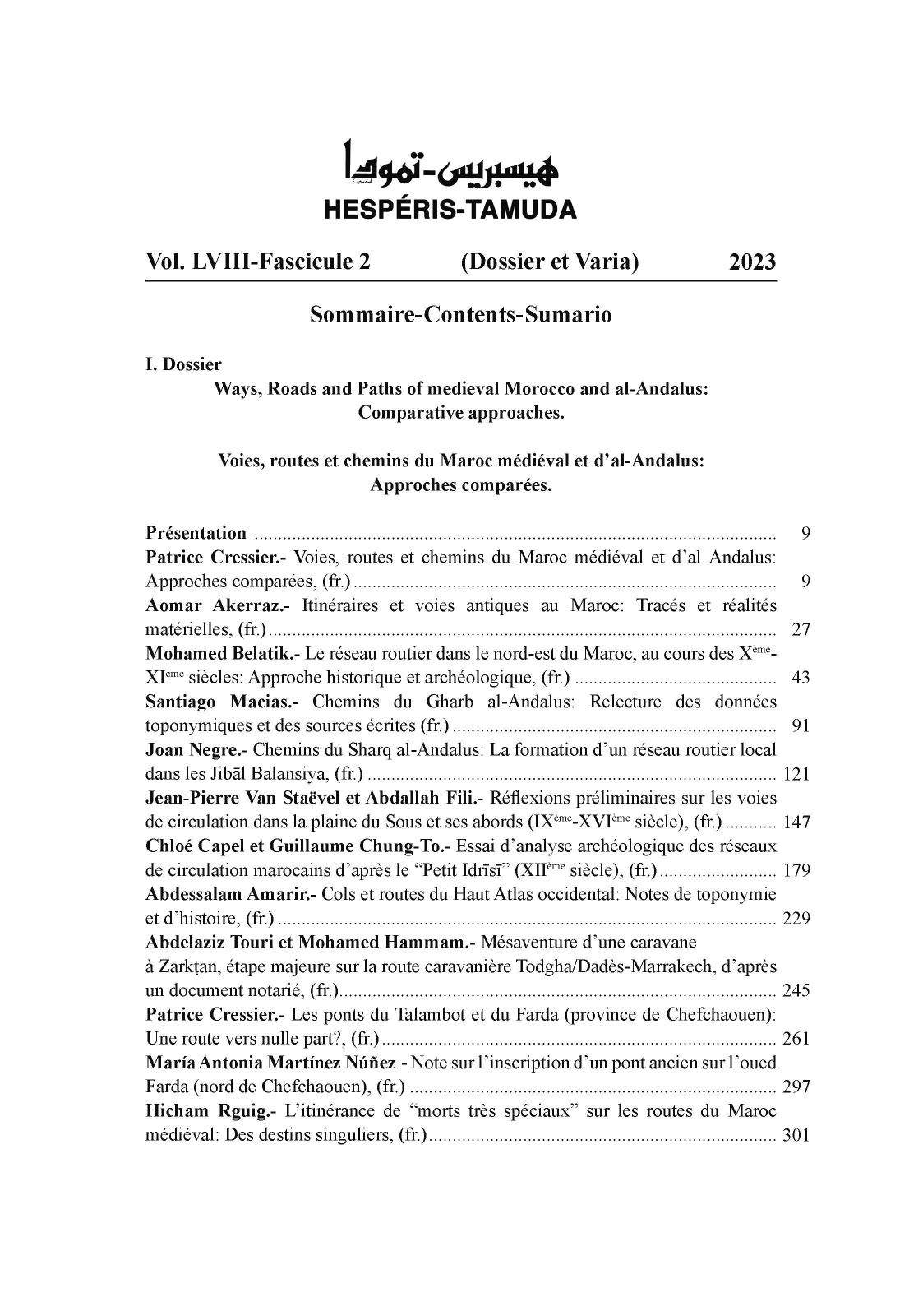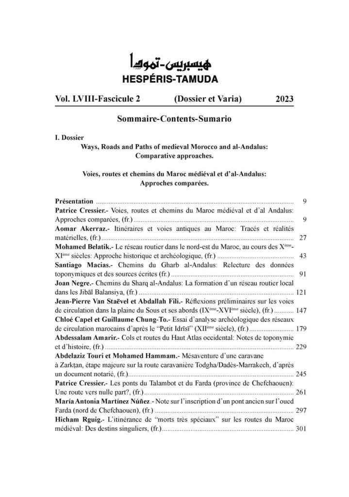 C’est avec plaisir que l’équipe éditoriale de Hespéris-Tamuda, (éditée depuis 1960 par la Faculté des Lettres et des sciences Humaines, Université Mohammed V de Rabat), vous annonce la mise en ligne du fascicule 2 (2023) du volume LVIII sous forme de dossier et varia. Le dossier coordonné par Patrice Cressier est intitulé: “Voies, routes et chemins du Maroc médiéval et d’al-Andalus: Approches comparées.” La mise en ligne de cette livraison coïncide avec la récente indexation de la revue auprès de Scopus Elsevier. S’ajoutant à Clarivate Analytics Web of Science (obtenue depuis 2016), cette nouvelle indexation ouvre certainement de nouveaux horizons à la recherche historique, et plus généralement aux sciences sociales du Maghreb, de l’occident musulman et de l’espace méditerranéen en donnant une nouvelle visibilité à notre revue sur la scène internationale.