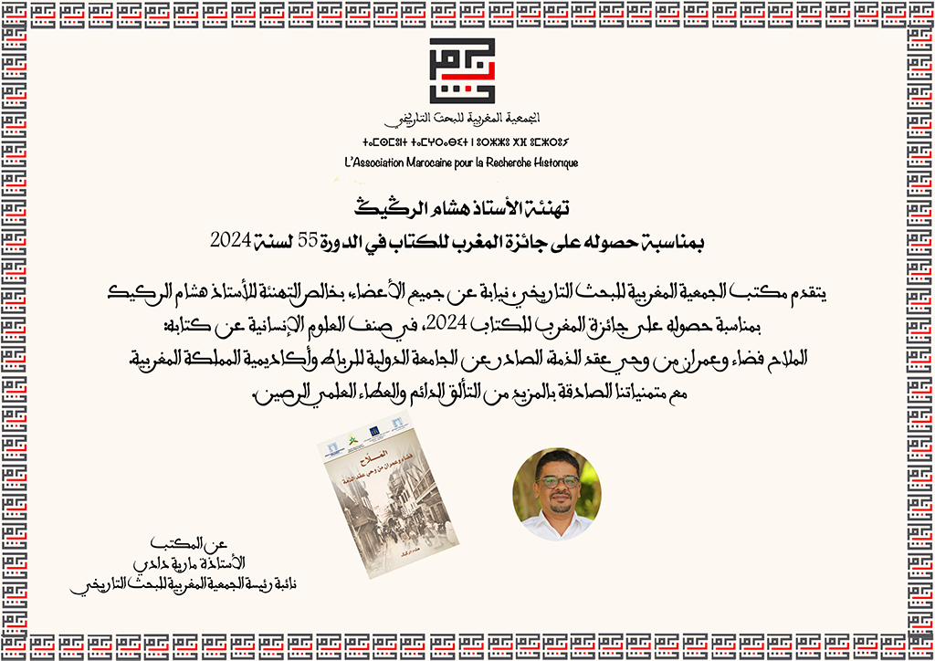 تهنئة الأستاذ هشام الركيك بمناسبة حصوله على جائزة المغرب للكتاب 2024 نشرت بواسطة:ABDELMALEK NASSIRI بتاريخ11:41 فيأخبار التاريخ والمؤرخين, جديد الموقع اضف تعليق شاركها ! tweet