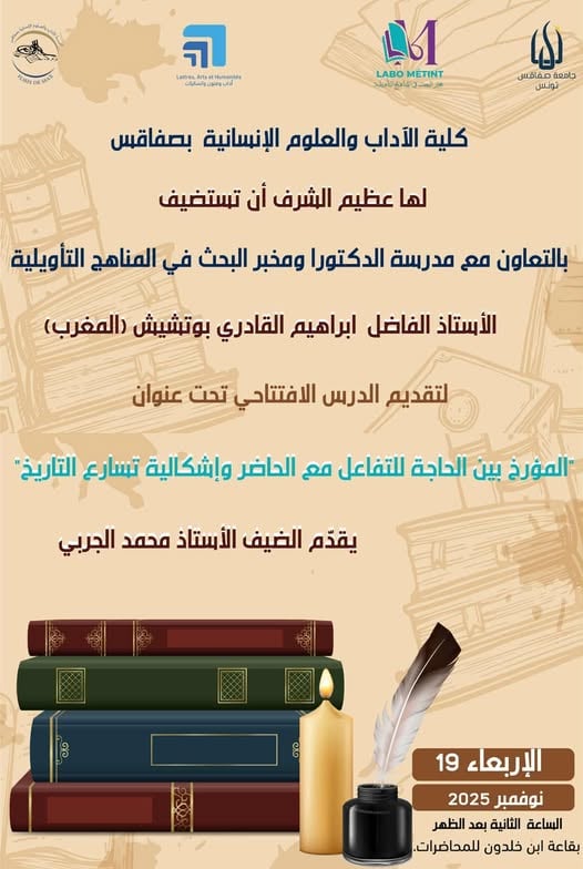 أنت هنا: الرئيسية / أخبار التاريخ والمؤرخين / يلقي الأستاذ إبراهيم القادري بوتشيش بكلية الآداب بصفاقس بتونس، بتنسيق مع مدرسة الدكتوراه ومخبر البحث في المناهج التأويلية درسا افتتاحيا بعنوان: ” المؤرخ بين الحاجة للتفاعل مع الحاضر وتسارع التاريخ” وذلك يوم الأربعاء 19 نوفمبر 2025 على الساعة الثانية بعد الظهر بقاعة ابن خلدون للمحاضرات.