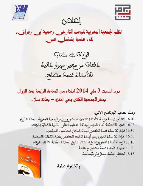 تنظم الجمعية المغربية للبحث التاريخي وجمعية أبي رقراق، لقاء علميا يشتمل على قراءات في كتاب: دفقات من معين سيرة ذاتية للأستاذ محمد مصلح