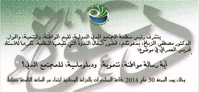 ندوة تكريمية للأستاذ إدريس العمراني في موضوع: أية رسالة مواطنة، تنموية، ودبلوماسية، للمجتمع المدني نشرت بواسطة:ABDELMALEK NASSIRI بتاريخ16:44 فيأرشيف مواد الموقع اضف تعليق شاركها ! tweet