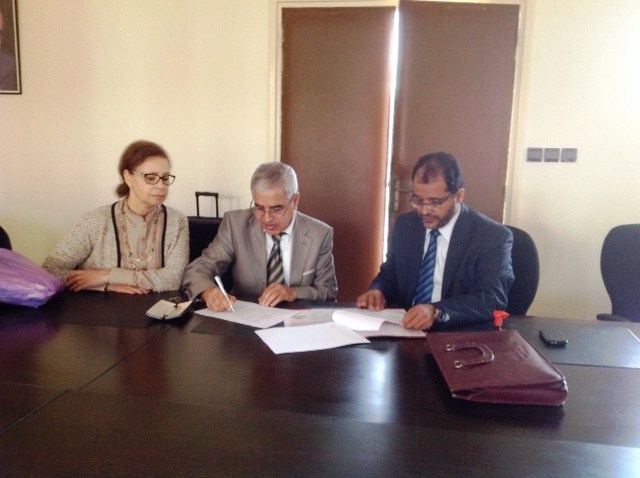 الأستاد عثمان المنصوري والأستاذ مساعد بن صالح الطيار أثناء توقيع الاتفاقية بحضور الأستاذة لطيفة الكندوز