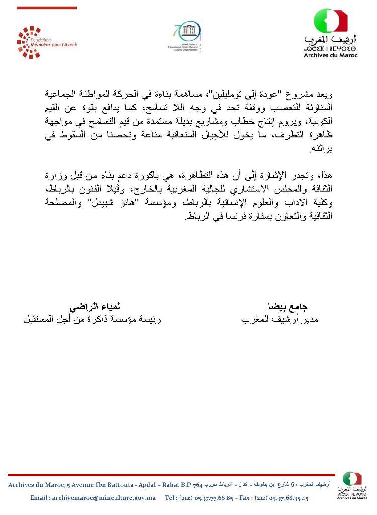 بلاغ صحفي عن ندوة دولية في موضوع: تومليلين: عودة إلى فضاءات الحوار والنقاش. نشرت بواسطة:ABDELMALEK NASSIRI بتاريخ19:51 فيأرشيف مواد الموقع اضف تعليق شاركها ! tweet