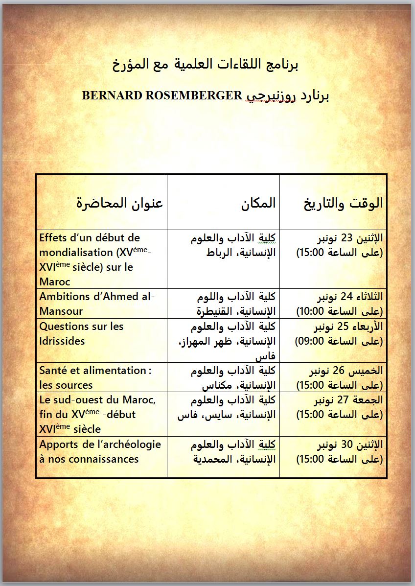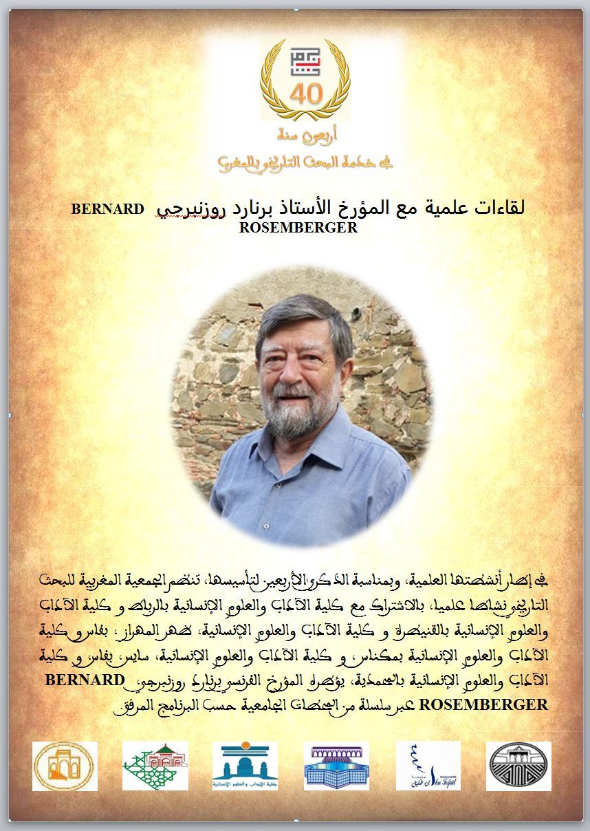 تنظم الجمعية المغربية للبحث التاريخي، في إطار أنشطتها العلمية، وبمناسبة الذكرى الأربعين لتأسيسها، لقاءات علمية، بالاشتراك مع كلية الآداب والعلوم الإنسانية بالرباط و كلية الآداب والعلوم الإنسانية بالقنيطرة و كلية الآداب والعلوم الإنسانية، ظهر المهراز ، بفاس و كلية الآداب والعلوم الإنسانية بمكناس ، و كلية الآداب والعلوم الإنسانية، سايس، بفاس، و كلية الآداب والعلوم الإنسانية بالمحمدية، يؤطرها المؤرخ الفرنسي الأستاذ برنارد روزنبرجي، BERNARD ROSEMBERGER عبر سلسلة من المحطات الجامعية حسب البرنامج المرفق.
