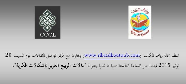 تنظم مجلة رباط الكتب(www.ribatalkoutoub.com) بتعاون مع مركز تواصل الثقافات يوم السبت 28 نونبر 2015 ابتداء من الساعة التاسعة صباحا ندوة بعنوان “مآلات الربيع العربي:إشكالات فكرية”.