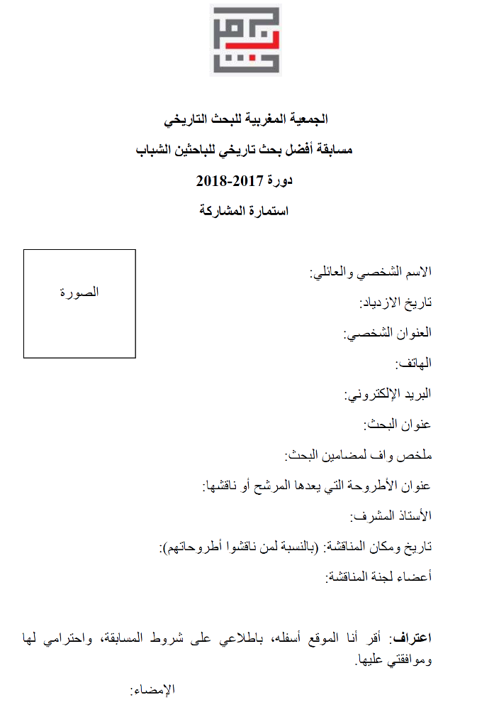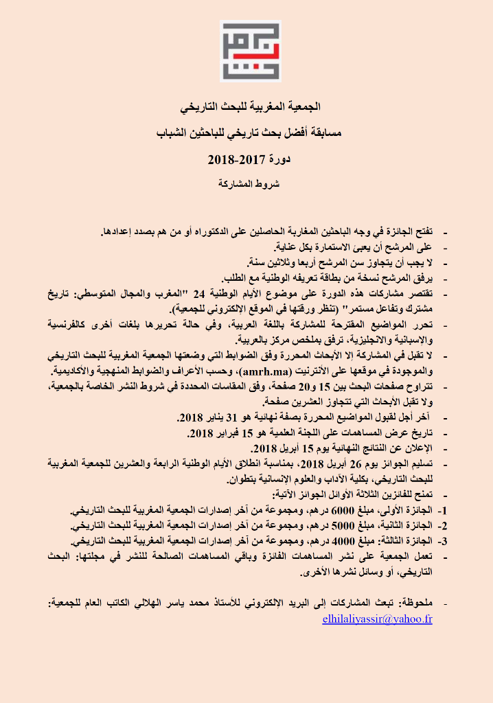 أنت هنا: الرئيسية / جديد الموقع / إعلان الجمعية المغربية للبحث التاريخي عن مسابقة أفضل بحث تاريخي للباحثين الشباب دورة 2017-2018