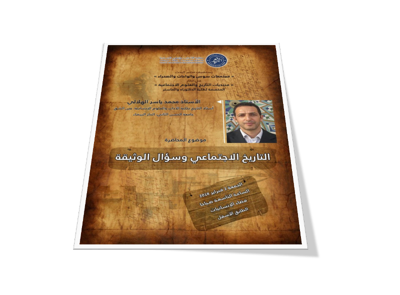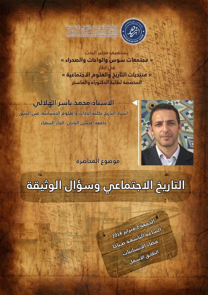 أنت هنا: الرئيسية / مع الباحثين / يستضيف مختبر البحث: مجتمعات سوس والواحات والصحراء، في إطار منتديات التاريخ والعلوم الاجتماعية، المخصصة لطلبة الدكتوراه والماستر، الأستاذ محمد ياسر الهلالي، لإلقاء محاضرة في موضوع: التاريخ الاجتماعي وسؤال الوثيقة، وذلك يوم الجمعة 2 فبراير 2018، على الساعة التاسعة صباحا، بفضاء الإنسانيات، الطابق الأسفل، برحاب كلية الآداب والعلوم الإنسانية ابن زهر بأكادير.