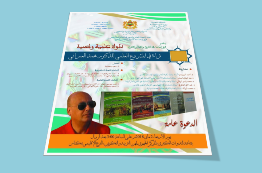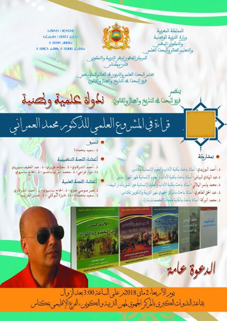 ينظم فريق البحث في التاريخ والمجال والقانون بالمركز الجهوي لمهن التربية والتكوين، فاس – مكناس، ندوة علمية وطنية: قراءة في المشروع العلمي للأستاذ محمد العمراني.