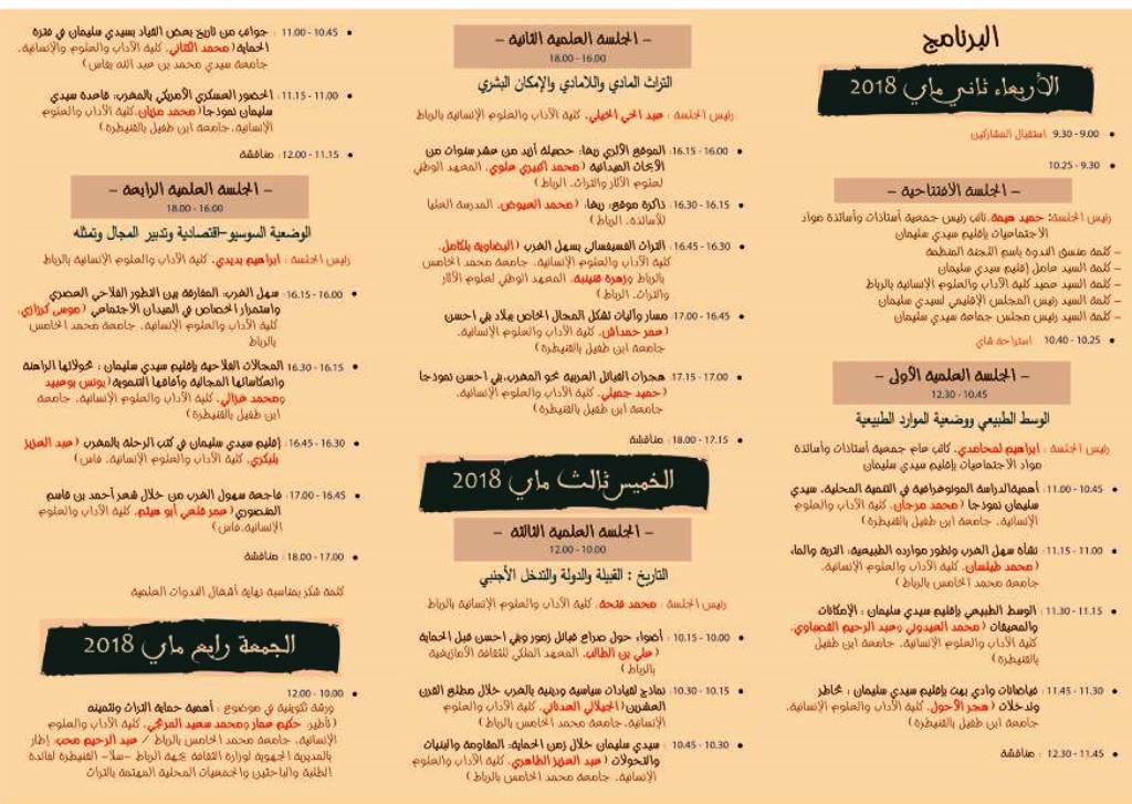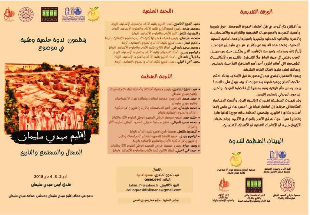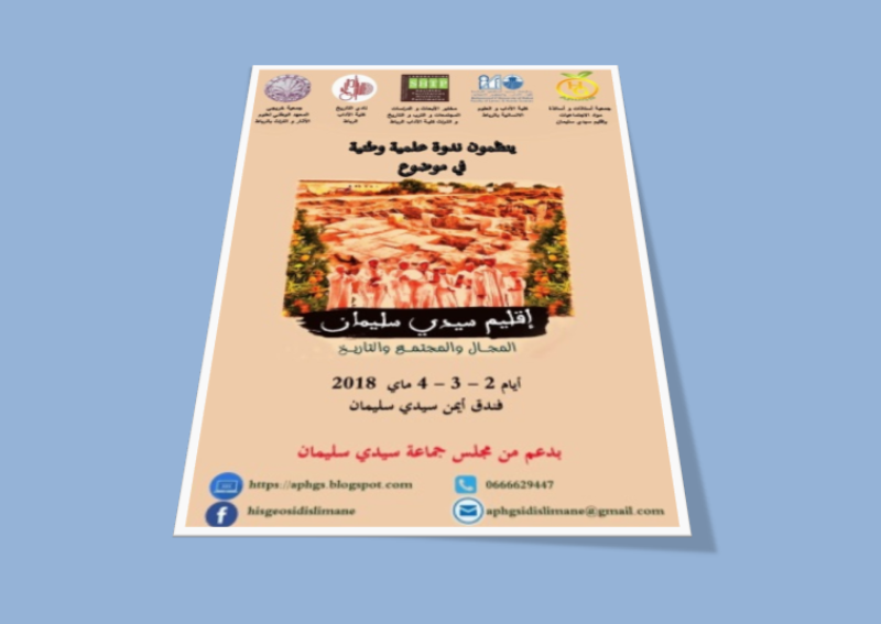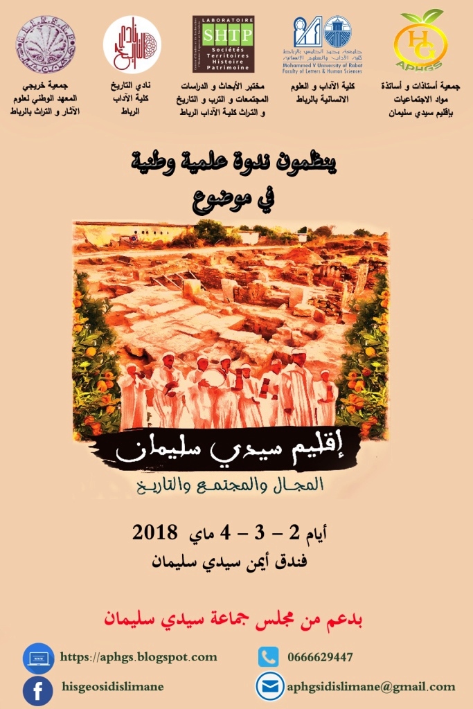 أنت هنا: الرئيسية / أخبار التاريخ والمؤرخين / تنظم جمعية أستاذات وأساتذة مواد الاجتماعيات بإقليم سيدي سليمان وكلية الآداب والعلوم الإنسانية بالرباط ومختبر الأبحاث والدراسات في المجتمعات والترب والتاريخ والتراث بكلية الآداب بالرباط وجمعية خريجي المعهد الوطني لعلوم التراث والآثار ونادي التاريخ بكلية الآداب بالرباط، وبدعم من مجلس جماعة سيدي سليمان: الندوة العلمية الوطنية في موضوع: إقليم سيدي سليمان: المجال والمجتمع والتاريخ” أيام 2-3-4 ماي 2018 بفندق أيمن بسيدي سليمان. الدعوة للعموم.