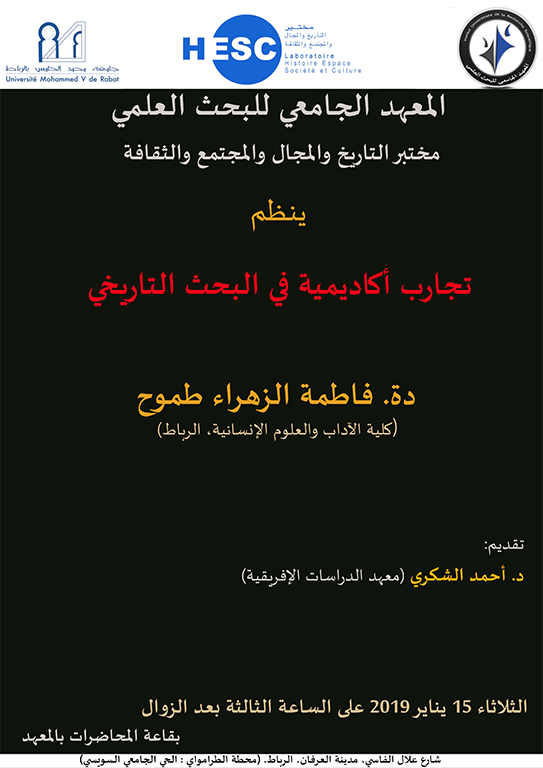 ينظم مختبر التاريخ والمجال والمجتمع والثقافة بالمعهد الجامعي للبحث العلمي تجارب أكاديمية في البحث التاريخي، يستضيف الأستاذة فاطمة الزهراء طموح، تقديم الأستاذ أحمد الشكري.